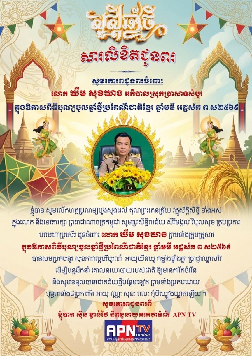 ព័ត៌មានជាតិ សូមគោរពជូនចំពោះ លោក ឃឹម សុខឃាង អភិបាលនៃគណៈអភិបាលស្រុកប្រាសាទសំបូរ ក្នុងឱកាសពិធីបុណ្យចូលឆ្នាំថ្មីប្រពៃណីជាតិខ្មែរ ឆ្នាំមមី អដ្ឋស័ក ព.ស២៥៦៩ បានសមប្រកបនូវ សុខភាពល្អបរិបូរណ៍ អាយុយឺនយូ កម្លាំងខ្លាំងក្លា ប្រាជ្ញាឈ្លាសវៃ ដើម្បីបន្តដឹកនាំ គោលនយោបាយរបស់ជាតិ ឱ្យមានការីកចំរើន និងសូមទទួលបានជោគជ័យថ្មីបន្ថែមទៀត ព្រមទាំងប្រកបដោយ ពុទ្ធពរទាំង៤ប្រការគឺ៖ អាយុ វណ្ណៈ សុខៈ ពលៈ កុំបីឃ្លៀងឃ្លាតឡើយ ។ សូមគោរពជូនពរពី ខ្ញុំបាទ ស៊ិន ខ្វាន់ថៃ និពន្ធនាយកគេហទំព័រ APN TV APNTV April 5, 2026 Post navigation Previous: សូមគោរពជូនចំពោះ លោក ឧត្តមសេនីយ៍ត្រី ម៉េង ស្រ៊ុនមេបញ្ជាការកងរាជអាវុធហត្ថខេត្តកំពង់ស្ពឺ ក្នុងឱកាសពិធីបុណ្យចូលឆ្នាំថ្មីប្រពៃណីជាតិខ្មែរ ឆ្នាំមមី អដ្ឋស័ក ព.ស២៥៦៩ បានសមប្រកបនូវ សុខភាពល្អបរិបូរណ៍ អាយុយឺនយូ កម្លាំងខ្លាំងក្លា ប្រាជ្ញាឈ្លាសវៃ ដើម្បីបន្តដឹកនាំ គោលនយោបាយរបស់ជាតិ ឱ្យមានការីកចំរើន និងសូមទទួលបានជោគជ័យថ្មីបន្ថែមទៀត ព្រមទាំងប្រកបដោយ ពុទ្ធពរទាំង៤ប្រការគឺ៖ អាយុ វណ្ណៈ សុខៈ ពលៈ កុំបីឃ្លៀងឃ្លាតឡើយ ។ សូមគោរពជូនពរពី ខ្ញុំបាទ ស៊ិន ខ្វាន់ថៃ និពន្ធនាយកគេហទំព័រ APN TVNext: សូមគោរពជូនចំពោះ លោក សុវណ្ណ ប៊ុនធឿន អភិបាលនៃគណៈអភិបាលស្រុកកោះកុង ក្នុងឱកាសពិធីបុណ្យចូលឆ្នាំថ្មីប្រពៃណីជាតិខ្មែរ ឆ្នាំមមី អដ្ឋស័ក ព.ស២៥៦៩ បានសមប្រកបនូវ សុខភាពល្អបរិបូរណ៍ អាយុយឺនយូ កម្លាំងខ្លាំងក្លា ប្រាជ្ញាឈ្លាសវៃ ដើម្បីបន្តដឹកនាំ គោលនយោបាយរបស់ជាតិ ឱ្យមានការីកចំរើន និងសូមទទួលបានជោគជ័យថ្មីបន្ថែមទៀត ព្រមទាំងប្រកបដោយ ពុទ្ធពរទាំង៤ប្រការគឺ៖ អាយុ វណ្ណៈ សុខៈ ពលៈ កុំបីឃ្លៀងឃ្លាតឡើយ ។ សូមគោរពជូនពរពី ខ្ញុំបាទ ស៊ិន ខ្វាន់ថៃ និពន្ធនាយកគេហទំព័រ APN TV