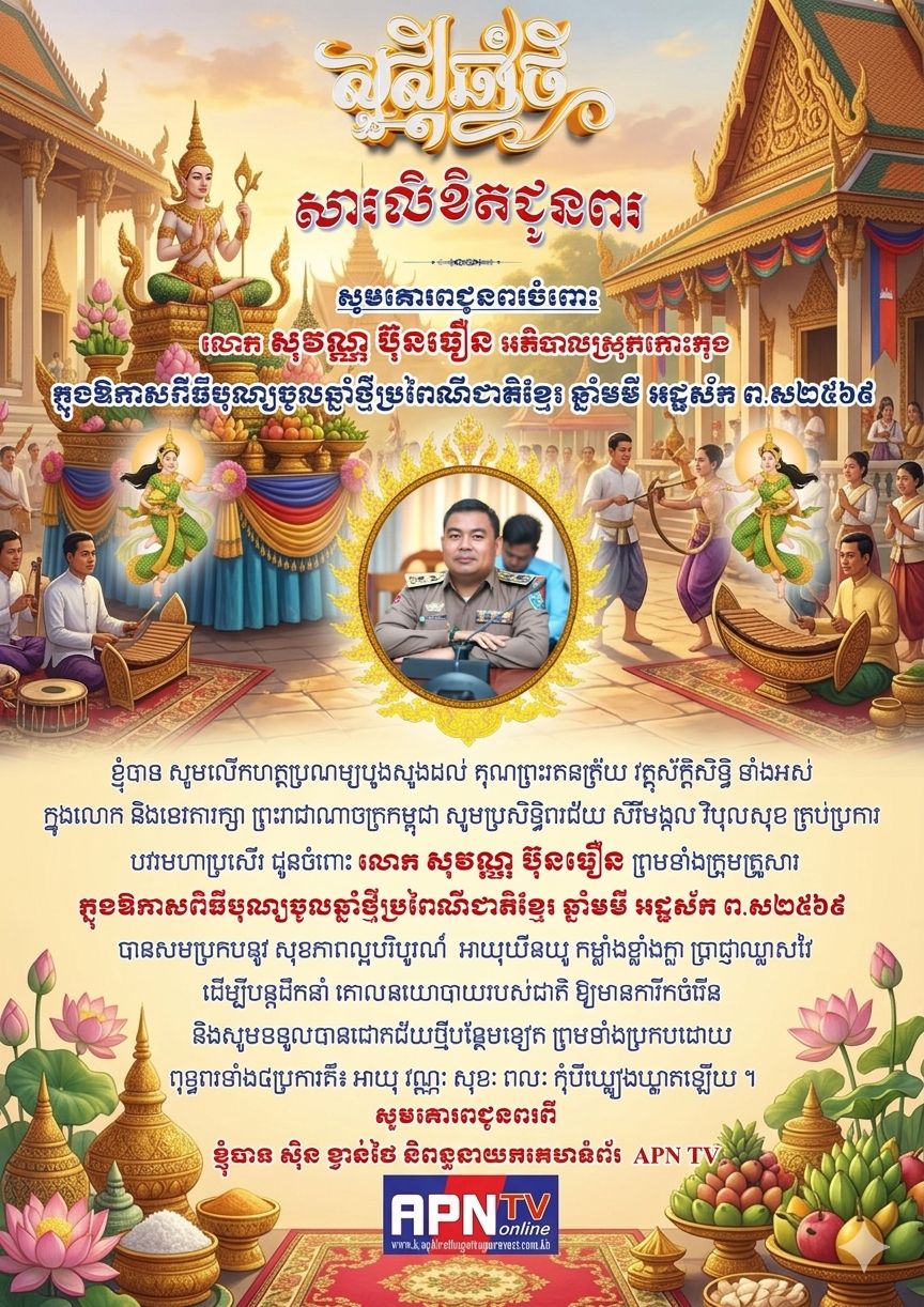 ព័ត៌មានជាតិ សូមគោរពជូនចំពោះ លោក សុវណ្ណ ប៊ុនធឿន អភិបាលនៃគណៈអភិបាលស្រុកកោះកុង ក្នុងឱកាសពិធីបុណ្យចូលឆ្នាំថ្មីប្រពៃណីជាតិខ្មែរ ឆ្នាំមមី អដ្ឋស័ក ព.ស២៥៦៩ បានសមប្រកបនូវ សុខភាពល្អបរិបូរណ៍ អាយុយឺនយូ កម្លាំងខ្លាំងក្លា ប្រាជ្ញាឈ្លាសវៃ ដើម្បីបន្តដឹកនាំ គោលនយោបាយរបស់ជាតិ ឱ្យមានការីកចំរើន និងសូមទទួលបានជោគជ័យថ្មីបន្ថែមទៀត ព្រមទាំងប្រកបដោយ ពុទ្ធពរទាំង៤ប្រការគឺ៖ អាយុ វណ្ណៈ សុខៈ ពលៈ កុំបីឃ្លៀងឃ្លាតឡើយ ។ សូមគោរពជូនពរពី ខ្ញុំបាទ ស៊ិន ខ្វាន់ថៃ និពន្ធនាយកគេហទំព័រ APN TV APNTV April 5, 2026 Post navigation Previous: សូមគោរពជូនចំពោះ លោក ឃឹម សុខឃាង អភិបាលនៃគណៈអភិបាលស្រុកប្រាសាទសំបូរ ក្នុងឱកាសពិធីបុណ្យចូលឆ្នាំថ្មីប្រពៃណីជាតិខ្មែរ ឆ្នាំមមី អដ្ឋស័ក ព.ស២៥៦៩ បានសមប្រកបនូវ សុខភាពល្អបរិបូរណ៍ អាយុយឺនយូ កម្លាំងខ្លាំងក្លា ប្រាជ្ញាឈ្លាសវៃ ដើម្បីបន្តដឹកនាំ គោលនយោបាយរបស់ជាតិ ឱ្យមានការីកចំរើន និងសូមទទួលបានជោគជ័យថ្មីបន្ថែមទៀត ព្រមទាំងប្រកបដោយ ពុទ្ធពរទាំង៤ប្រការគឺ៖ អាយុ វណ្ណៈ សុខៈ ពលៈ កុំបីឃ្លៀងឃ្លាតឡើយ ។ សូមគោរពជូនពរពី ខ្ញុំបាទ ស៊ិន ខ្វាន់ថៃ និពន្ធនាយកគេហទំព័រ APN TVNext: សូមគោរពជូនចំពោះ លោក ចេង មុន្នីរ៉ា អភិបាលនៃគណៈអភិបាលខណ្ឌសែនសុខ ក្នុងឱកាសពិធីបុណ្យចូលឆ្នាំថ្មីប្រពៃណីជាតិខ្មែរ ឆ្នាំមមី អដ្ឋស័ក ព.ស២៥៦៩ បានសមប្រកបនូវ សុខភាពល្អបរិបូរណ៍ អាយុយឺនយូ កម្លាំងខ្លាំងក្លា ប្រាជ្ញាឈ្លាសវៃ ដើម្បីបន្តដឹកនាំ គោលនយោបាយរបស់ជាតិ ឱ្យមានការីកចំរើន និងសូមទទួលបានជោគជ័យថ្មីបន្ថែមទៀត ព្រមទាំងប្រកបដោយ ពុទ្ធពរទាំង៤ប្រការគឺ៖ អាយុ វណ្ណៈ សុខៈ ពលៈ កុំបីឃ្លៀងឃ្លាតឡើយ ។ សូមគោរពជូនពរពី ខ្ញុំបាទ ស៊ិន ខ្វាន់ថៃ និពន្ធនាយកគេហទំព័រ APN TV